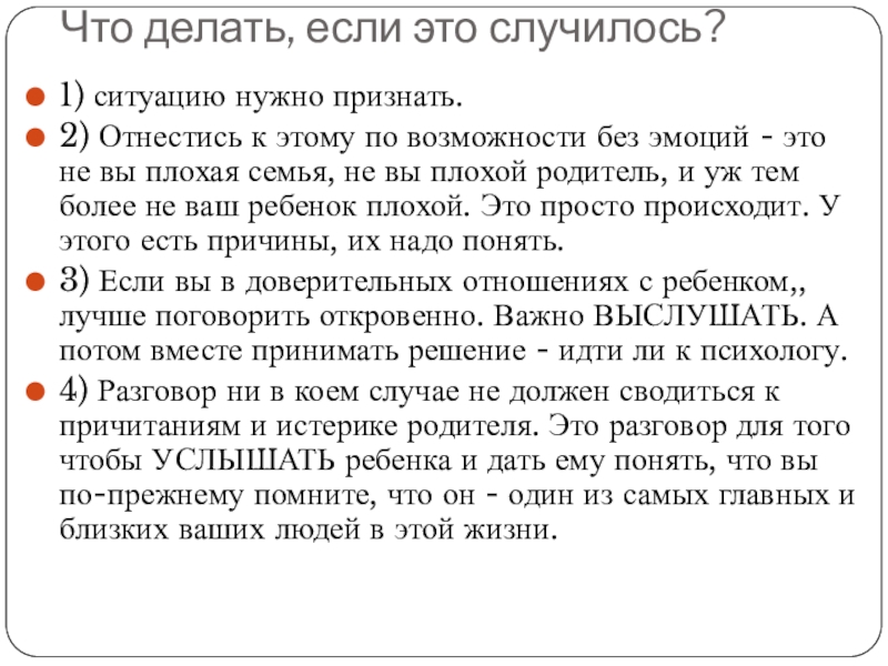 этому по возможности без эмоций - это не вы плохая семья, не вы плохой родитель, и уж тем более не ваш ребенок плохой. Это просто происходит. У этого есть причины, их надо понять.