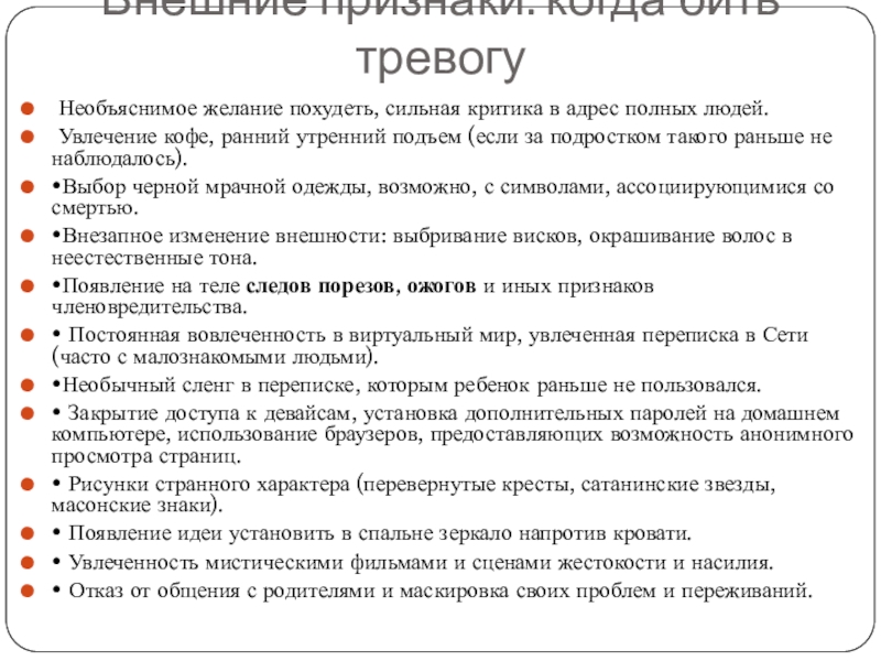 •Появление на теле следов порезов, ожогов и иных признаков членовредительства.