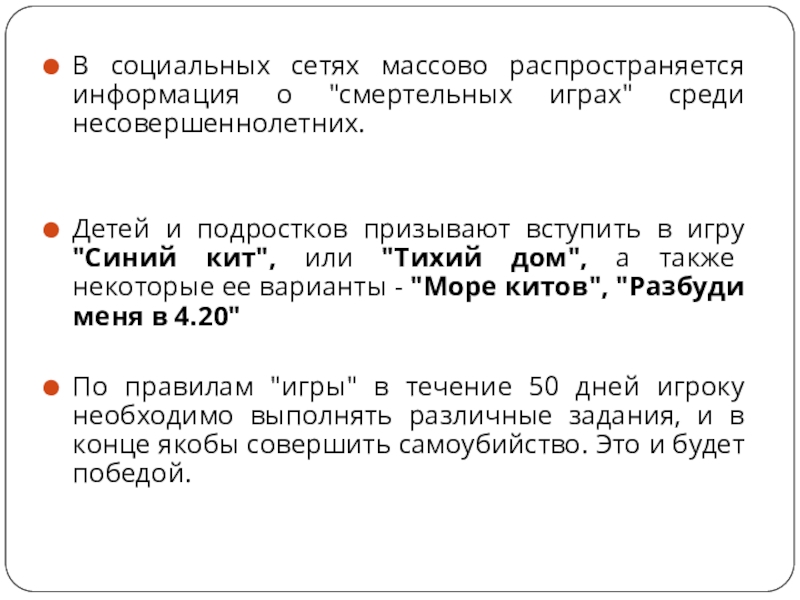 Слайд 2В социальных сетях массово распространяется информация о "смертельных играх" среди несовершеннолетних.