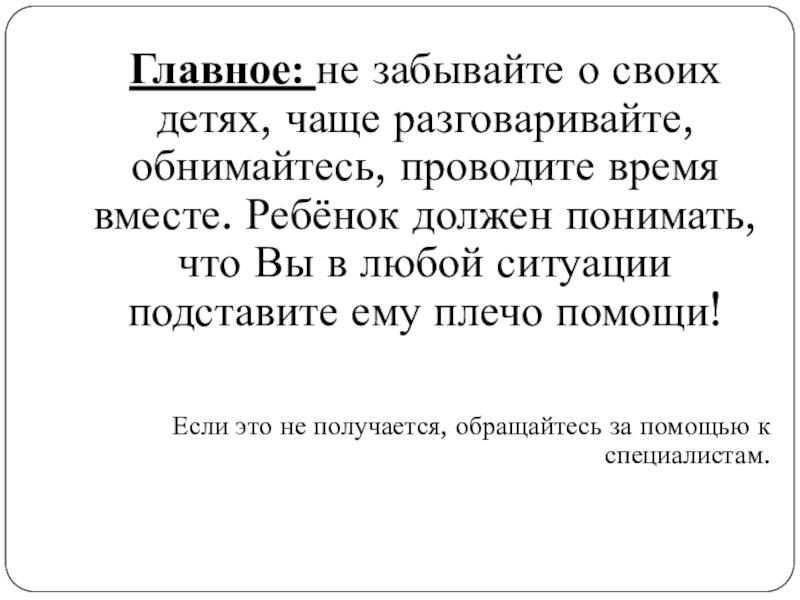 Слайд 8Главное: не забывайте о своих детях, чаще разговаривайте, обнимайтесь, проводите время