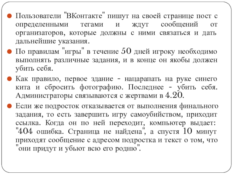 Если же подросток отказывается от выполнения финального задания, то есть завершить игру самоубийством, приходит ссылка. Когда он по ней переходит, компьютер выдает: "404 ошибка. Страница не найдена", а спустя 10 минут приходят сообщение с адресом подростка и текст о том, что "они придут и убьют всю его родню".