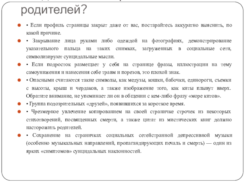 • Сохранение на страничках социальных сетейстранной депрессивной музыки (особенно музыкальных направлений, пропагандирующих печаль и смерть) — один из ярких «симптомов» суицидальных наклонностей.