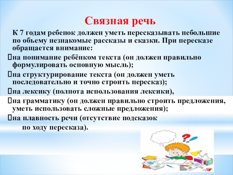 К 7 годам ребенок должен уметь пересказывать небольшие по объему