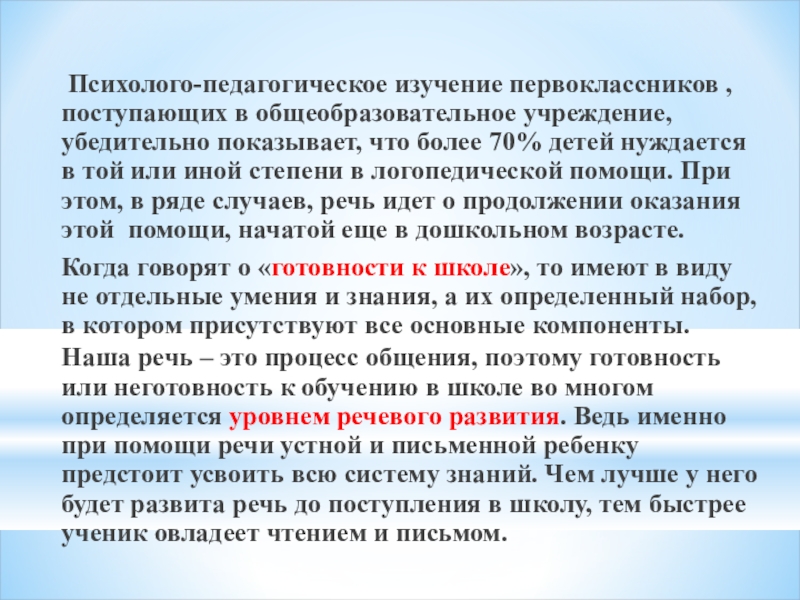 Наша речь – это процесс общения, поэтому готовность или неготовность к обучению в школе во многом определяется уровнем речевого развития. Ведь именно при помощи речи устной и письменной ребенку предстоит усвоить всю систему знаний. Чем лучше у него будет развита речь до поступления в школу, тем быстрее ученик овладеет чтением и письмом.