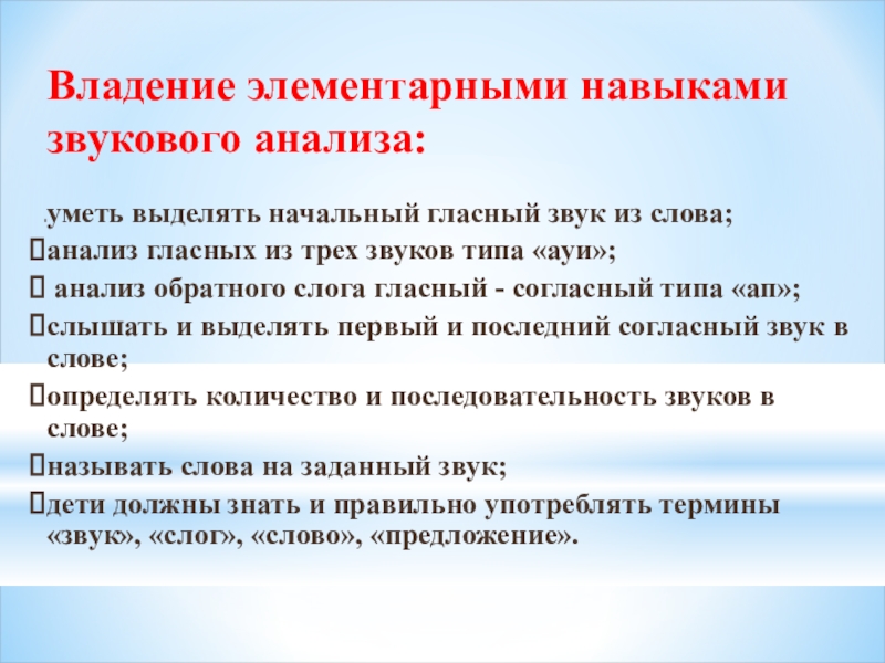Слайд 7Владение элементарными навыками звукового анализа: