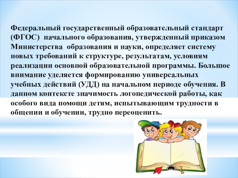 и науки, определяет систему новых требований к структуре, результатам, условиям реализации основной образовательной программы. Большое внимание уделяется формированию универсальных учебных действий (УДД) на начальном периоде обучения. В данном контексте значимость логопедической работы, как особого вида помощи детям, испытывающим трудности в общении и обучении, трудно переоценить.