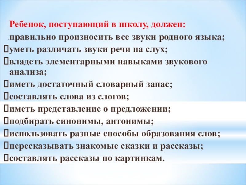 Слайд 5Ребенок, поступающий в школу, должен: