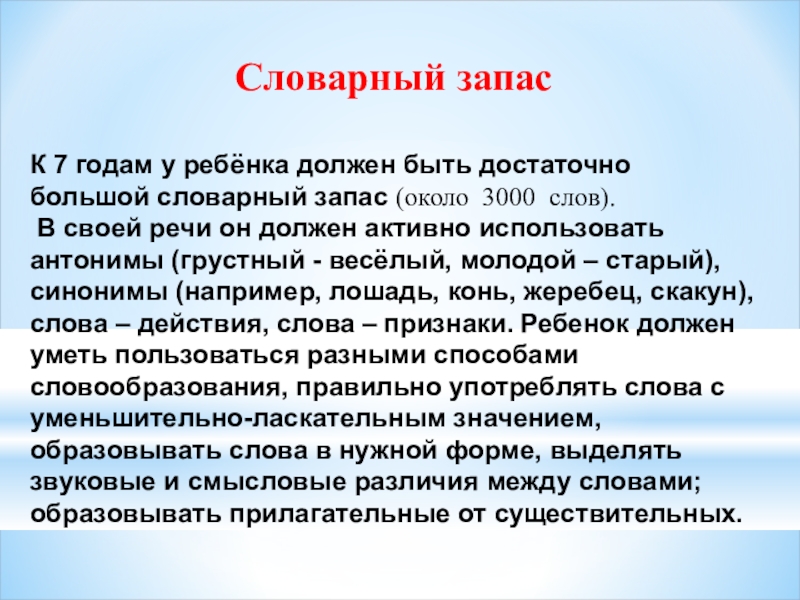В своей речи он должен активно использовать антонимы (грустный - весёлый, молодой – старый), синонимы (например, лошадь, конь, жеребец, скакун), слова – действия, слова – признаки. Ребенок должен уметь пользоваться разными способами словообразования, правильно употреблять слова с уменьшительно-ласкательным значением, образовывать слова в нужной форме, выделять звуковые и смысловые различия между словами; образовывать прилагательные от существительных.