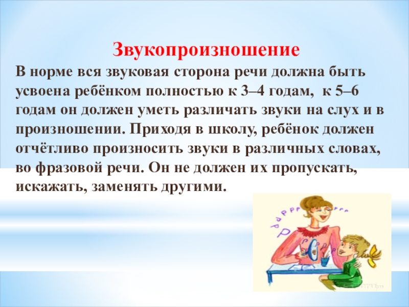 к 3–4 годам, к 5–6 годам он должен уметь различать звуки на слух и в произношении. Приходя в школу, ребёнок должен отчётливо произносить звуки в различных словах, во фразовой речи. Он не должен их пропускать, искажать, заменять другими.