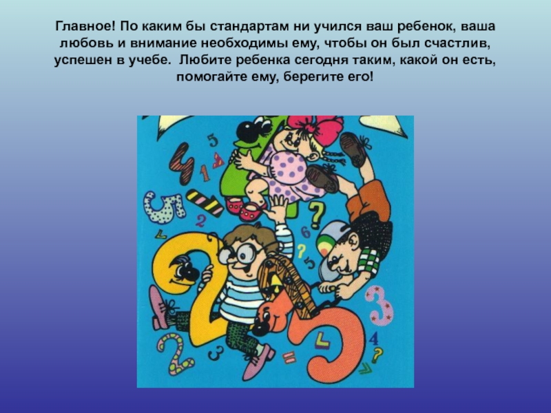Слайд 17Главное! По каким бы стандартам ни учился ваш ребенок, ваша любовь