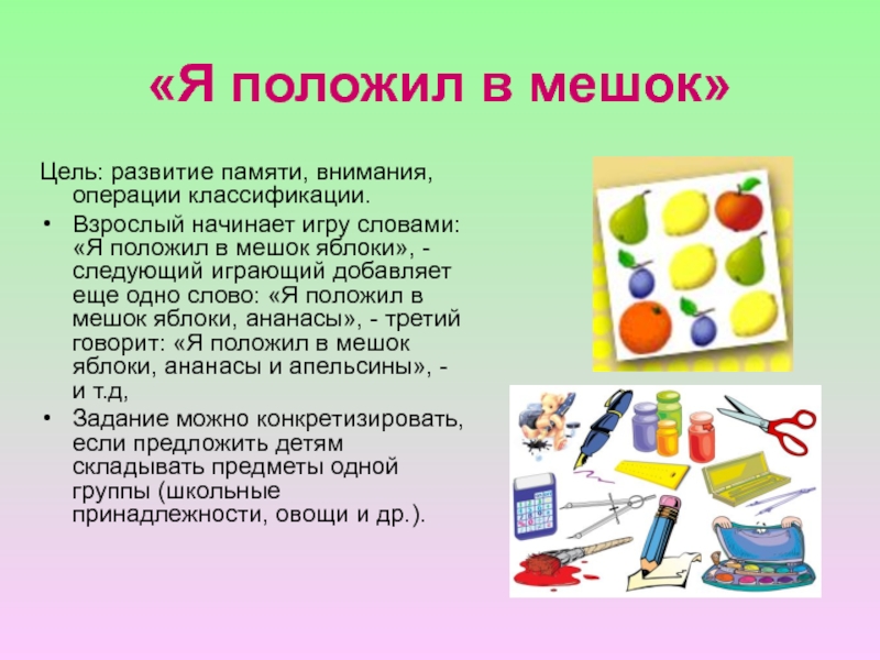 словами: «Я положил в мешок яблоки», - следующий играющий добавляет еще одно слово: «Я положил в мешок яблоки, ананасы», - третий говорит: «Я положил в мешок яблоки, ананасы и апельсины», - и т.д,