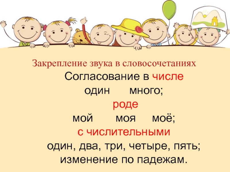 Закрепление звука в словосочетанияхСогласование в числеодин   много; родемой    моя   моё;с