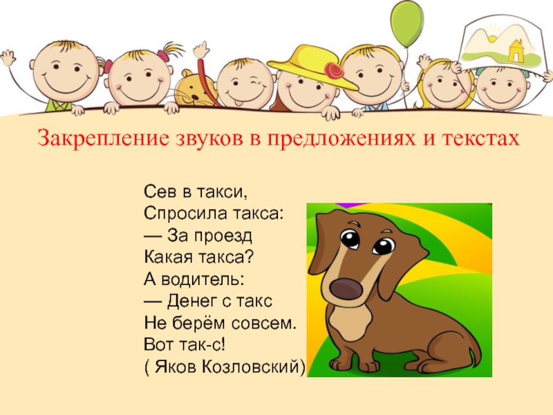 Закрепление звуков в предложениях и текстах Сев в такси, Спросила такса: — За проезд Какая такса?А водитель: