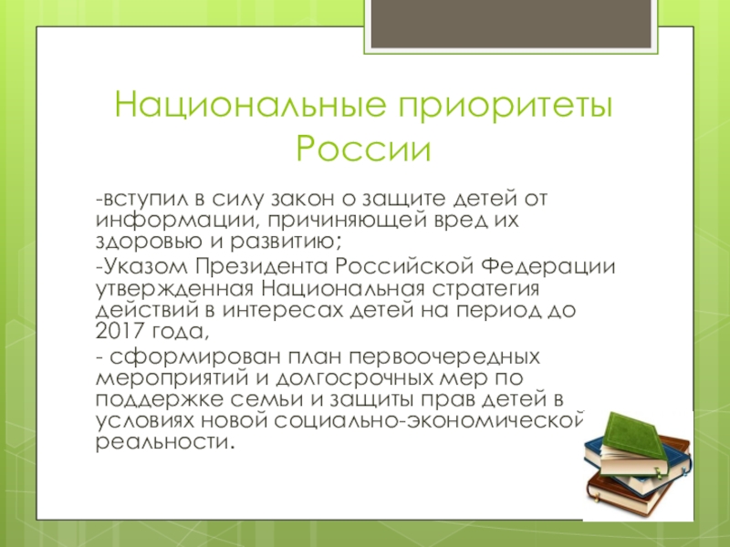 Национальные приоритеты России-вступил в силу закон о защите детей от информации, причиняющей вред их здоровью и развитию;-Указом