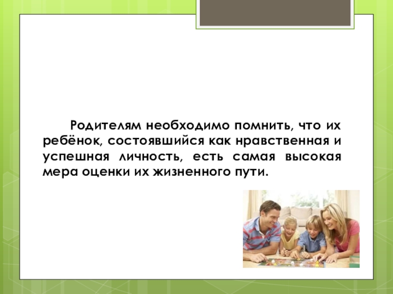 Слайд 14 Родителям необходимо помнить, что их ребёнок, состоявшийся как
