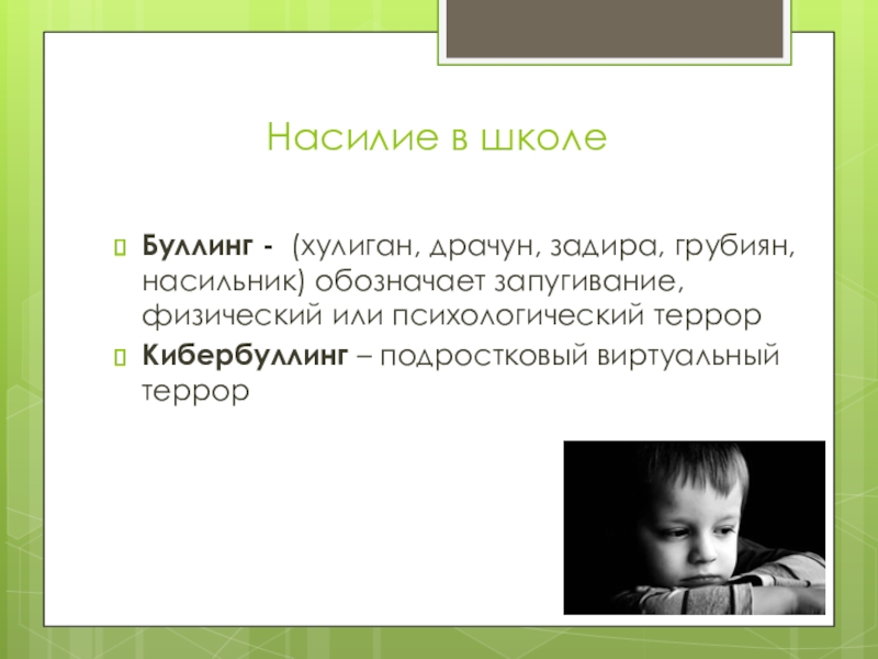 Насилие в школе Буллинг - (хулиган, драчун, задира, грубиян, насильник) обозначает запугивание, физический или психологический террорКибербуллинг –
