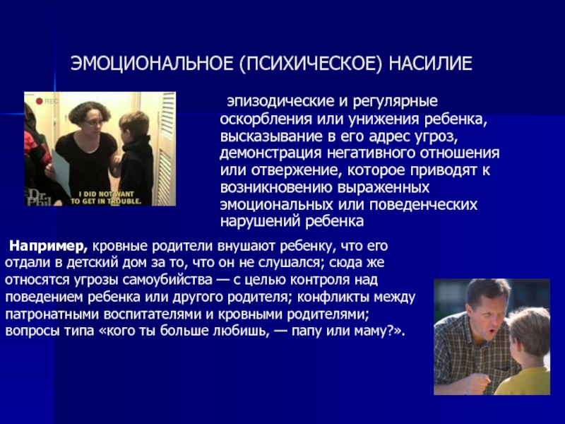 Например, кровные родители внушают ребенку, что его отдали в детский дом за то, что он не слушался; сюда же относятся угрозы самоубийства — с целью контроля над поведением ребенка или другого родителя; конфликты между патронатными воспитателями и кровными родителями; вопросы типа «кого ты больше любишь, — папу или маму?».