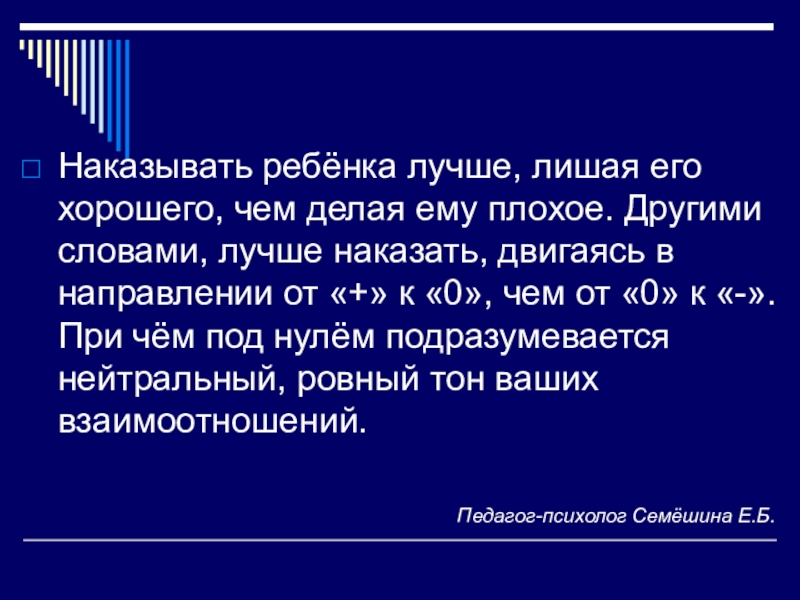 словами, лучше наказать, двигаясь в направлении от «+» к «0», чем от «0» к «-». При чём под нулём подразумевается нейтральный, ровный тон ваших взаимоотношений.
