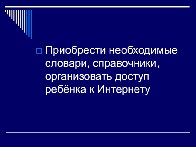 Приобрести необходимые словари, справочники, организовать доступ ребёнка к Интернету