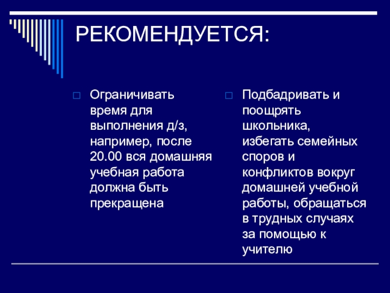 Подбадривать и поощрять школьника, избегать семейных споров и конфликтов вокруг домашней учебной работы, обращаться в трудных случаях за помощью к учителю
