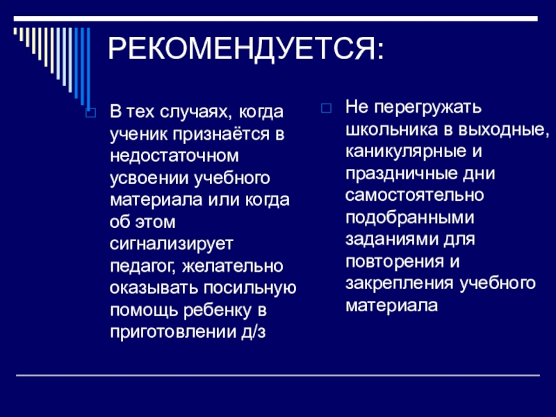 Не перегружать школьника в выходные, каникулярные и праздничные дни самостоятельно подобранными заданиями для повторения и закрепления учебного материала