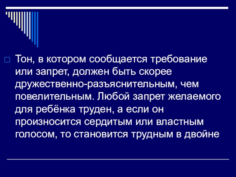 чем повелительным. Любой запрет желаемого для ребёнка труден, а если он произносится сердитым или властным голосом, то становится трудным в двойне