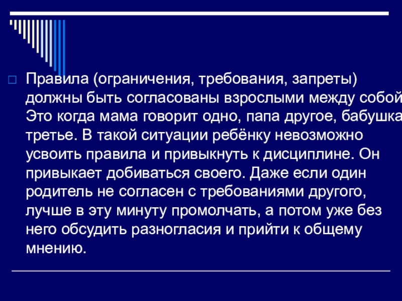 Правила (ограничения, требования, запреты) должны быть согласованы взрослыми между собой. Это