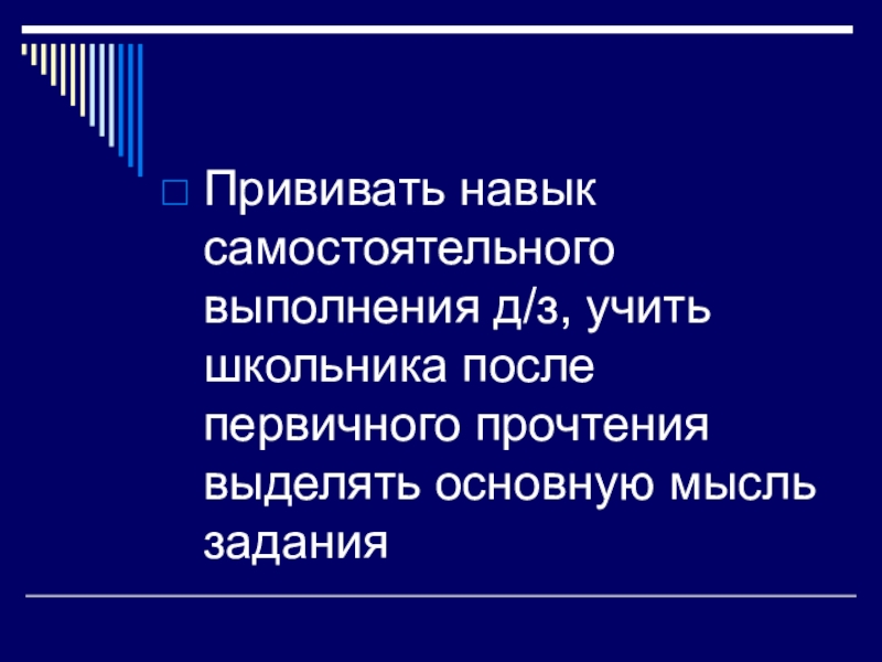 Прививать навык самостоятельного выполнения д/з, учить школьника после первичного прочтения выделять