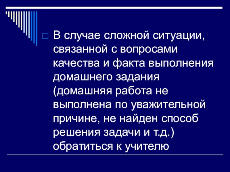 домашнего задания (домашняя работа не выполнена по уважительной причине, не найден способ решения задачи и т.д.) обратиться к учителю