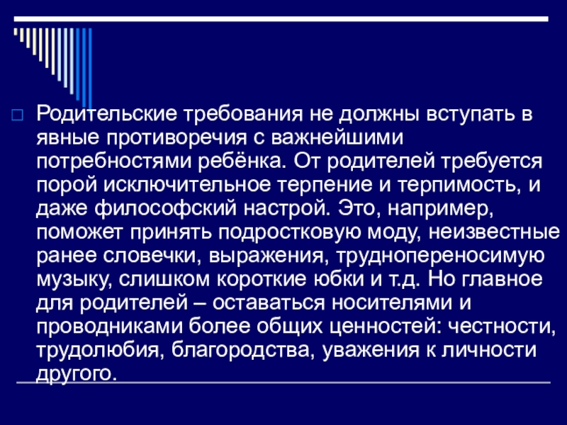 ребёнка. От родителей требуется порой исключительное терпение и терпимость, и даже философский настрой. Это, например, поможет принять подростковую моду, неизвестные ранее словечки, выражения, труднопереносимую музыку, слишком короткие юбки и т.д. Но главное для родителей – оставаться носителями и проводниками более общих ценностей: честности, трудолюбия, благородства, уважения к личности другого.