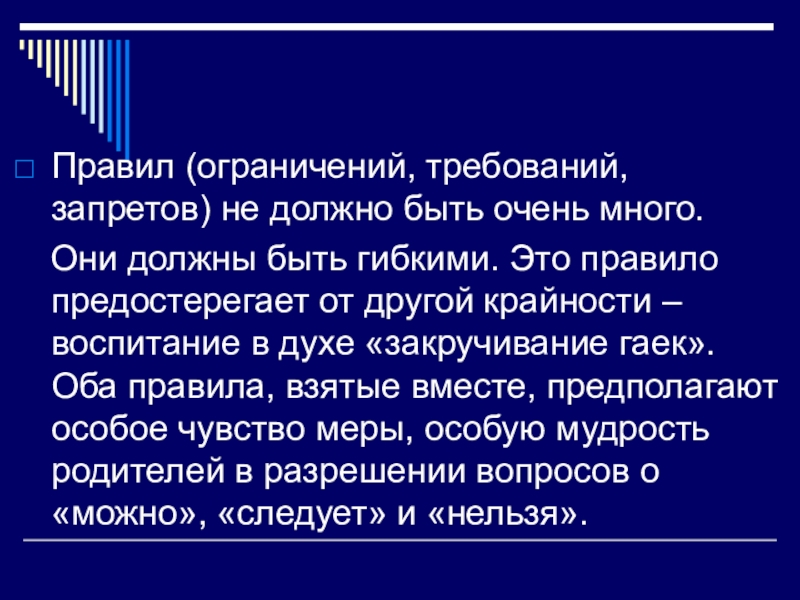Они должны быть гибкими. Это правило предостерегает от другой крайности – воспитание в духе «закручивание гаек». Оба правила, взятые вместе, предполагают особое чувство меры, особую мудрость родителей в разрешении вопросов о «можно», «следует» и «нельзя».