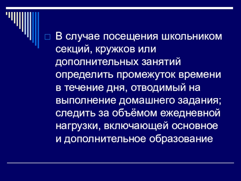 времени в течение дня, отводимый на выполнение домашнего задания; следить за объёмом ежедневной нагрузки, включающей основное и дополнительное образование