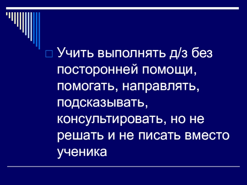 Учить выполнять д/з без посторонней помощи, помогать, направлять, подсказывать, консультировать, но