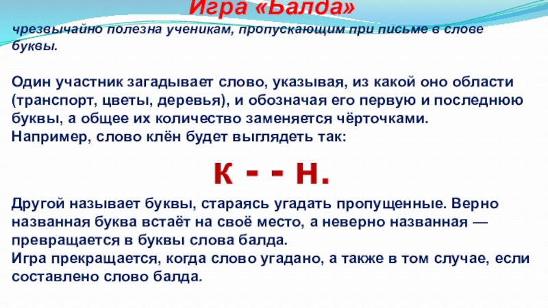 Другой называет буквы, стараясь угадать пропущенные. Верно названная буква встаёт на своё место, а неверно названная — превращается в буквы слова балда.