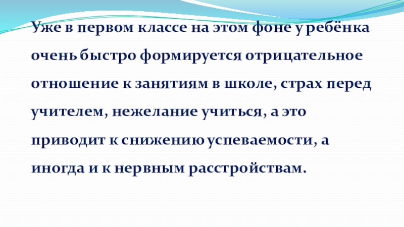формируется отрицательное отношение к занятиям в школе, страх перед учителем, нежелание учиться, а это приводит к снижению успеваемости, а иногда и к нервным расстройствам.