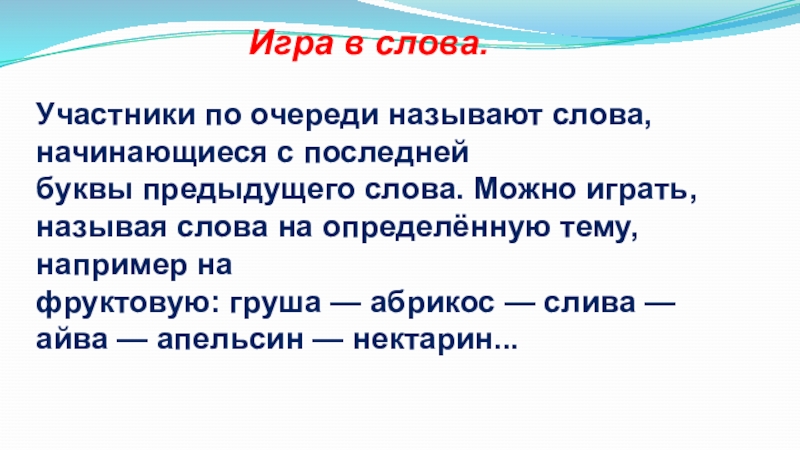 предыдущего слова. Можно играть, называя слова на определённую тему, например на