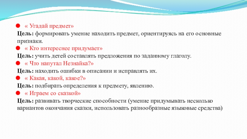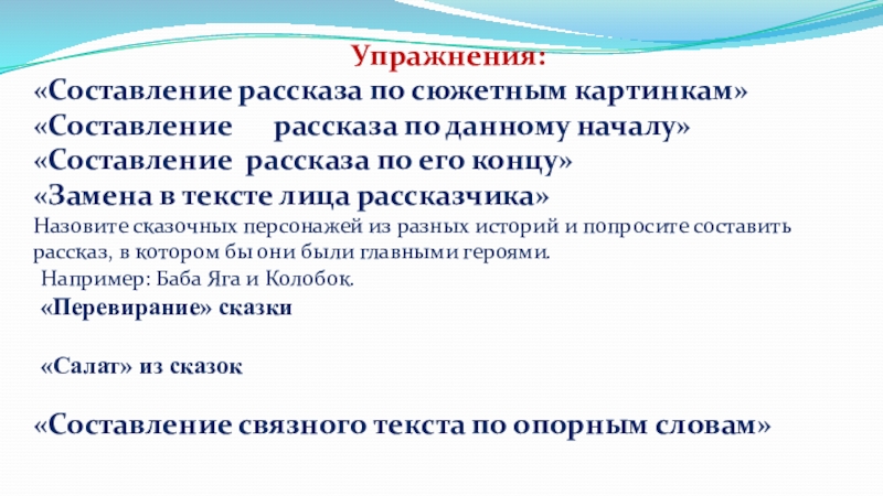 Цель: развивать творческие способности (умение придумывать несколько вариантов окончания сказки, использовать разнообразные языковые средства)