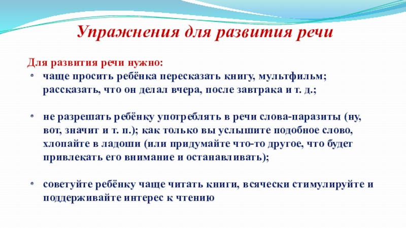 не разрешать ребёнку употреблять в речи слова-паразиты (ну, вот, значит и т. п.); как только вы услышите подобное слово, хлопайте в ладоши (или придумайте что-то другое, что будет привлекать его внимание и останавливать);