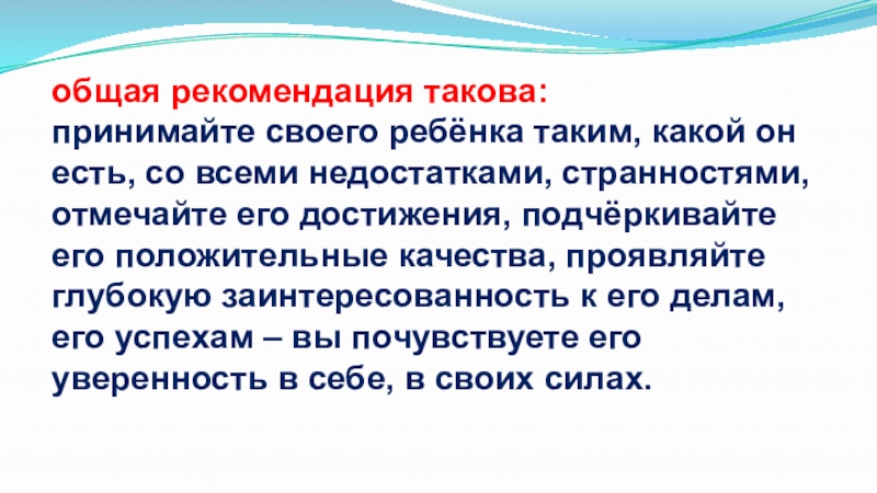 недостатками, странностями, отмечайте его достижения, подчёркивайте его положительные качества, проявляйте глубокую заинтересованность к его делам, его успехам – вы почувствуете его уверенность в себе, в своих силах.