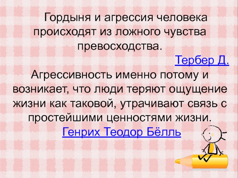 Слайд 2 Гордыня и агрессия человека происходят из ложного чувства превосходства.