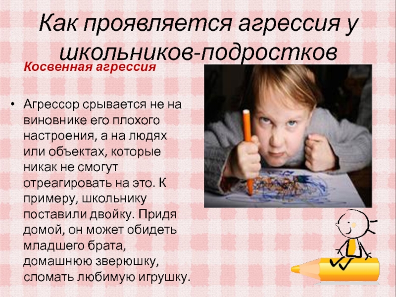 плохого настроения, а на людях или объектах, которые никак не смогут отреагировать на это. К примеру, школьнику поставили двойку. Придя домой, он может обидеть младшего брата, домашнюю зверюшку, сломать любимую игрушку.