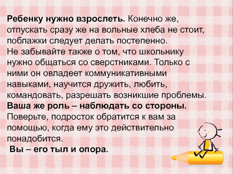 Слайд 20Ребенку нужно взрослеть. Конечно же, отпускать сразу же на вольные хлеба