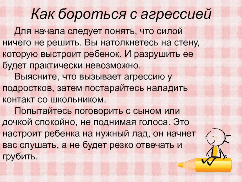 Выясните, что вызывает агрессию у подростков, затем постарайтесь наладить контакт со школьником.