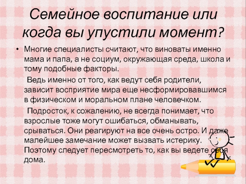 Ведь именно от того, как ведут себя родители, зависит восприятие мира еще несформировавшимся в физическом и моральном плане человечком.