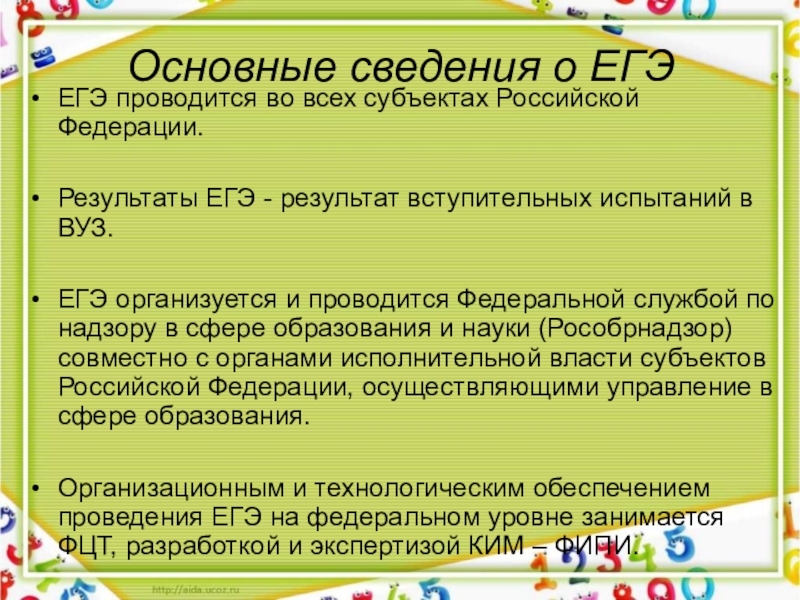 Организационным и технологическим обеспечением проведения ЕГЭ на федеральном уровне занимается ФЦТ, разработкой и экспертизой КИМ – ФИПИ.