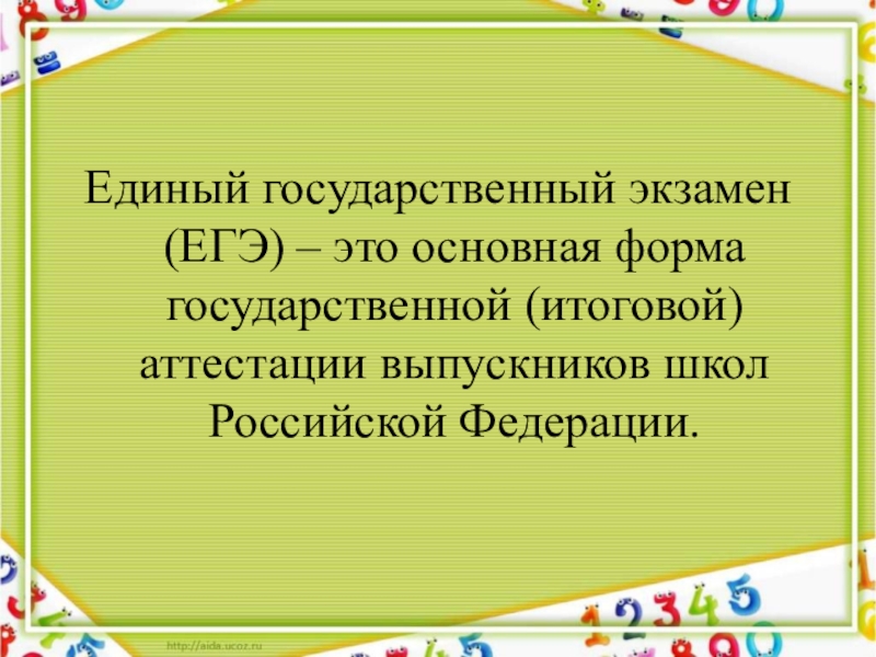 Слайд 2Единый государственный экзамен (ЕГЭ) – это основная форма государственной (итоговой) аттестации