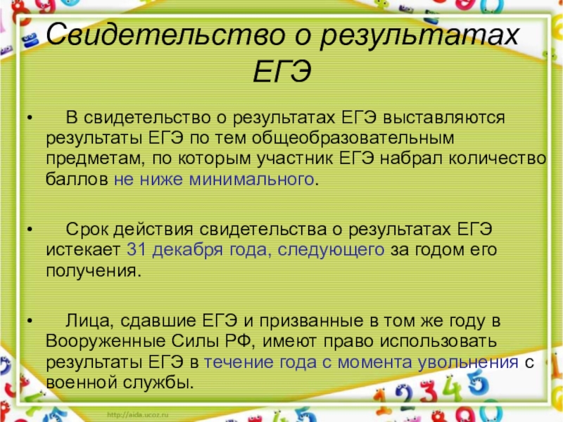 Срок действия свидетельства о результатах ЕГЭ истекает 31 декабря года, следующего за годом его получения.
