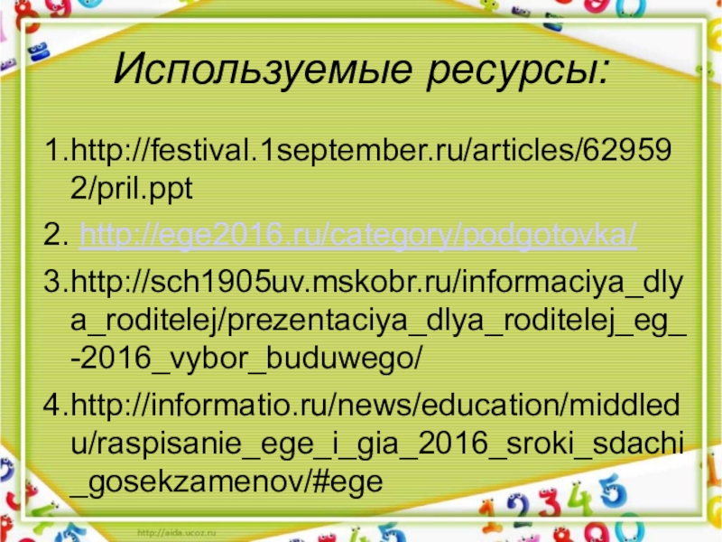 3.http://sch1905uv.mskobr.ru/informaciya_dlya_roditelej/prezentaciya_dlya_roditelej_eg_-2016_vybor_buduwego/