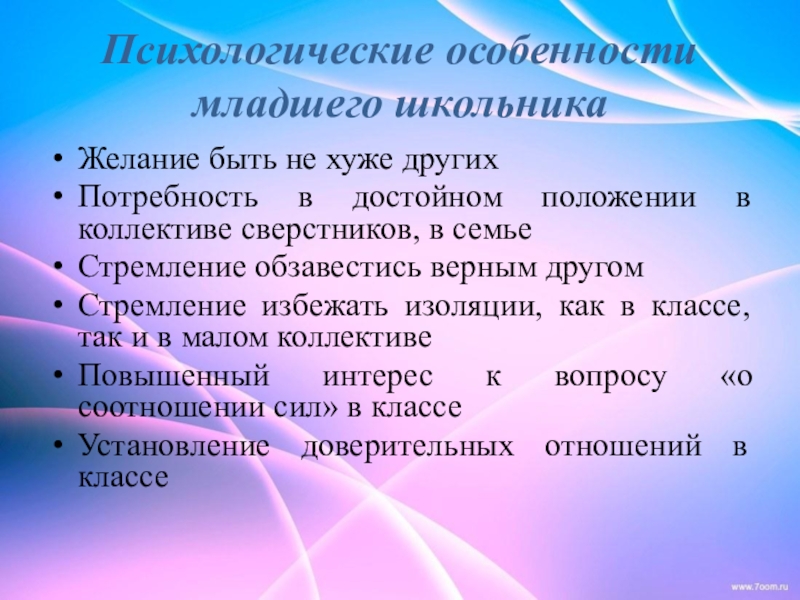 Психологические особенности младшего школьникаЖелание быть не хуже другихПотребность в достойном положении в коллективе сверстников, в семьеСтремление обзавестись
