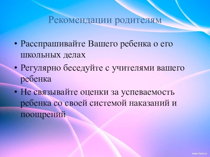 Рекомендации родителямРасспрашивайте Вашего ребенка о его школьных делахРегулярно беседуйте с учителями вашего ребенкаНе связывайте оценки за успеваемость